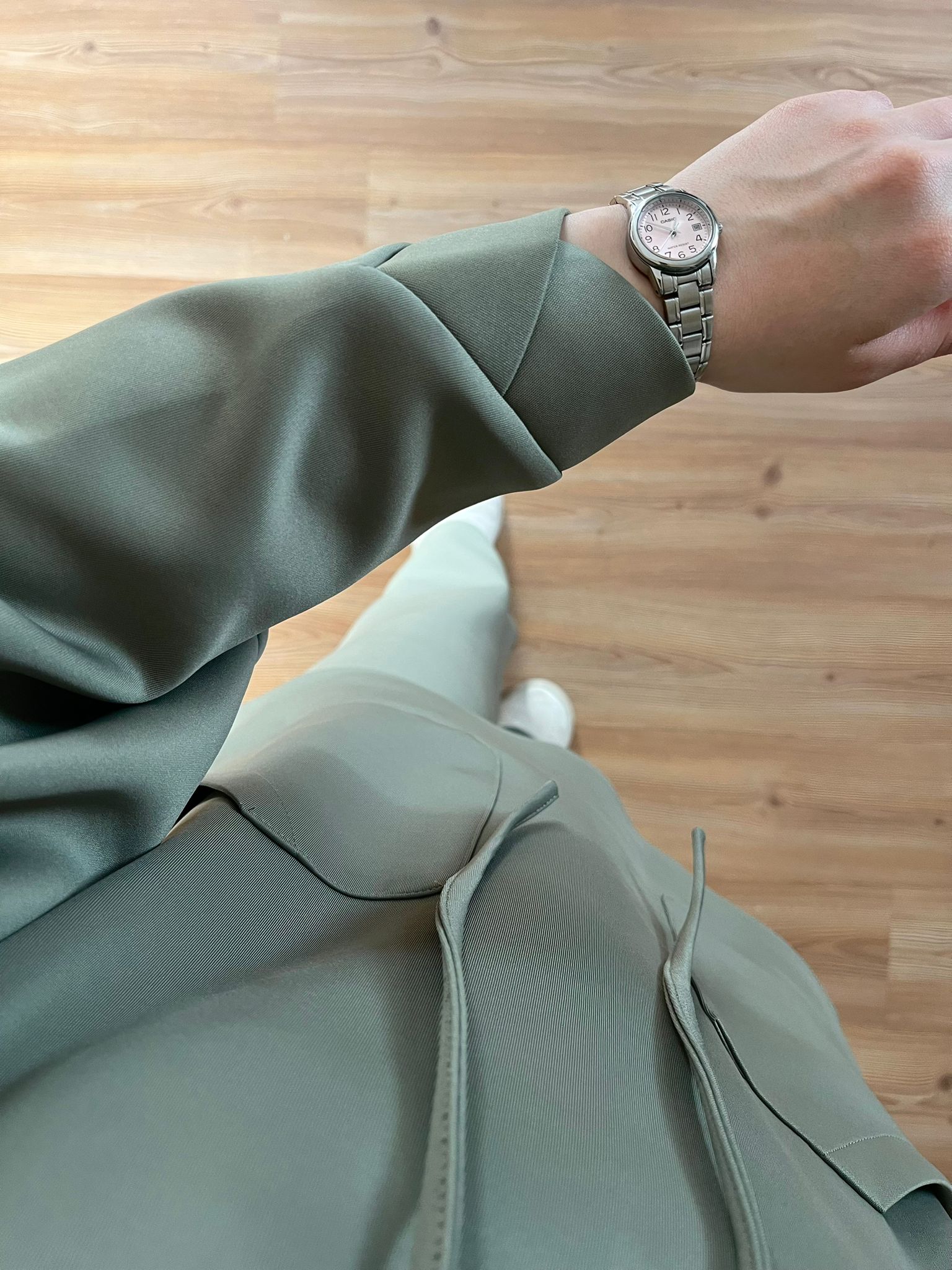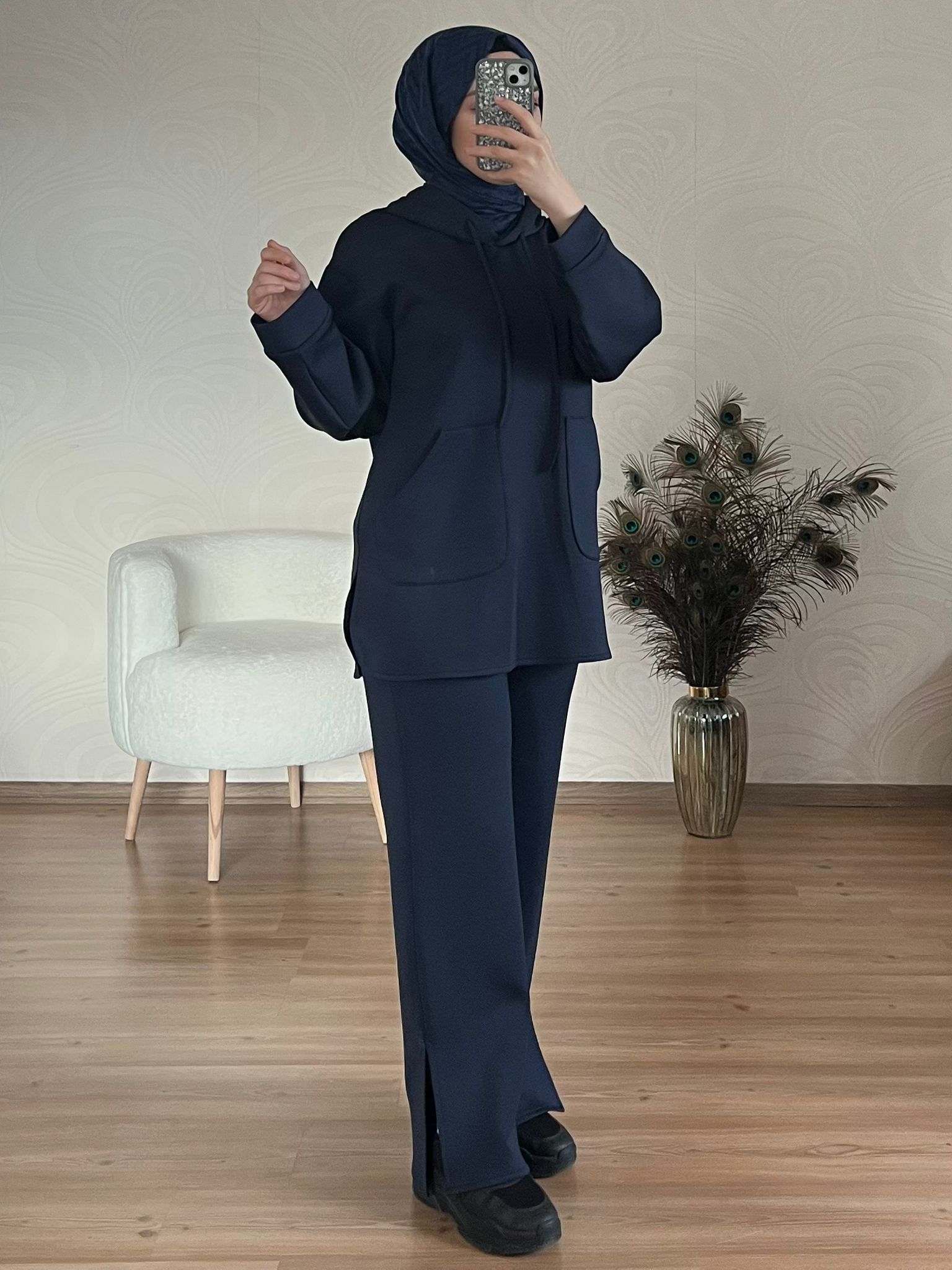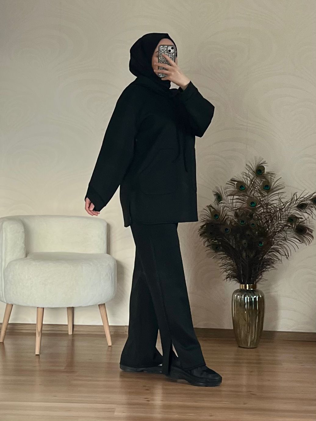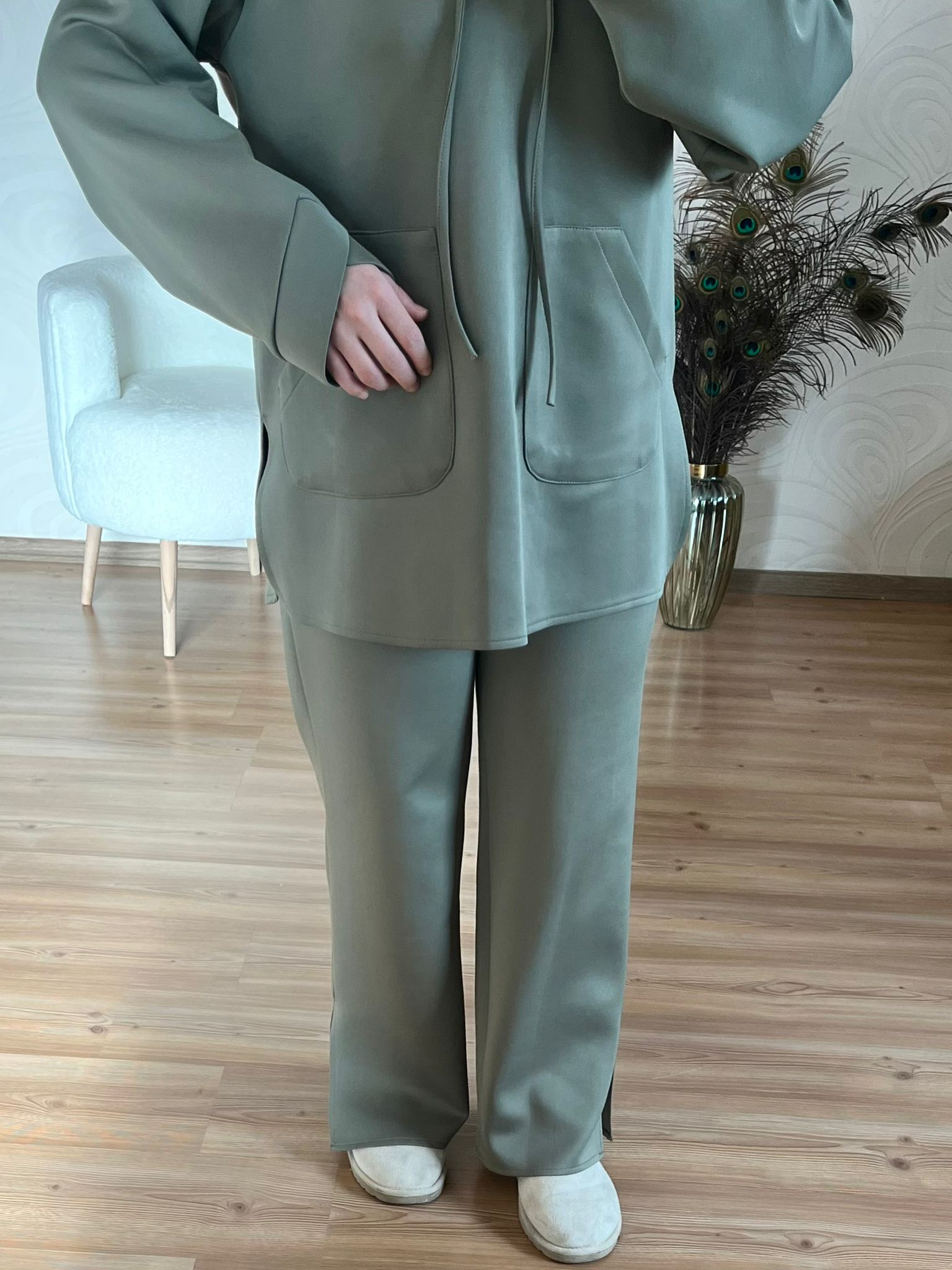 Pantolon beli lastiklidir, paçası yırtmaçlıdır